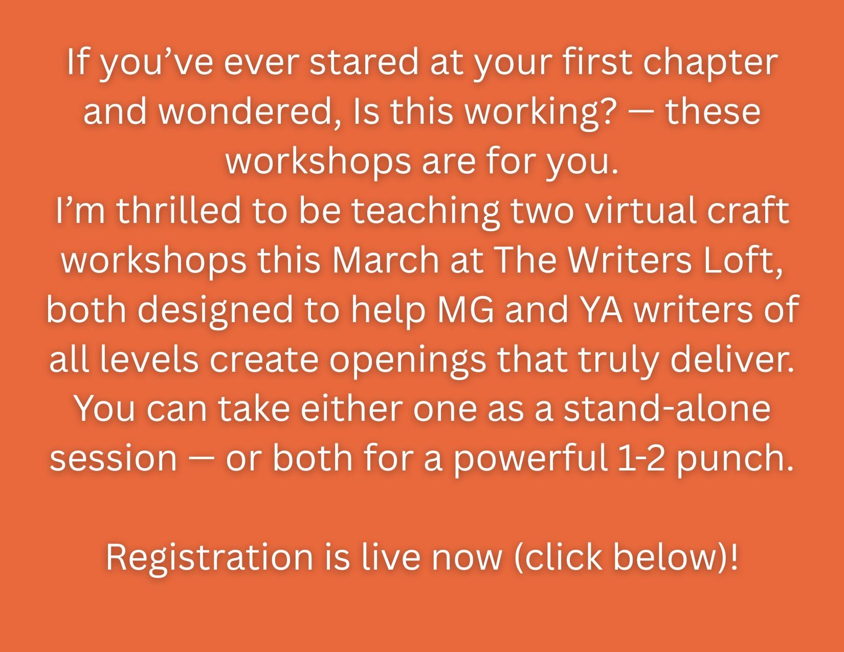 If you’ve written a chapter book or middle grade novel for young readers (or want to), don’t miss this amazing opportunity from The Writers’ Loft to get professional feedback on your story! And if you don’t have pages ready to submit, you can listen and learn from critiques of other writers’ work.